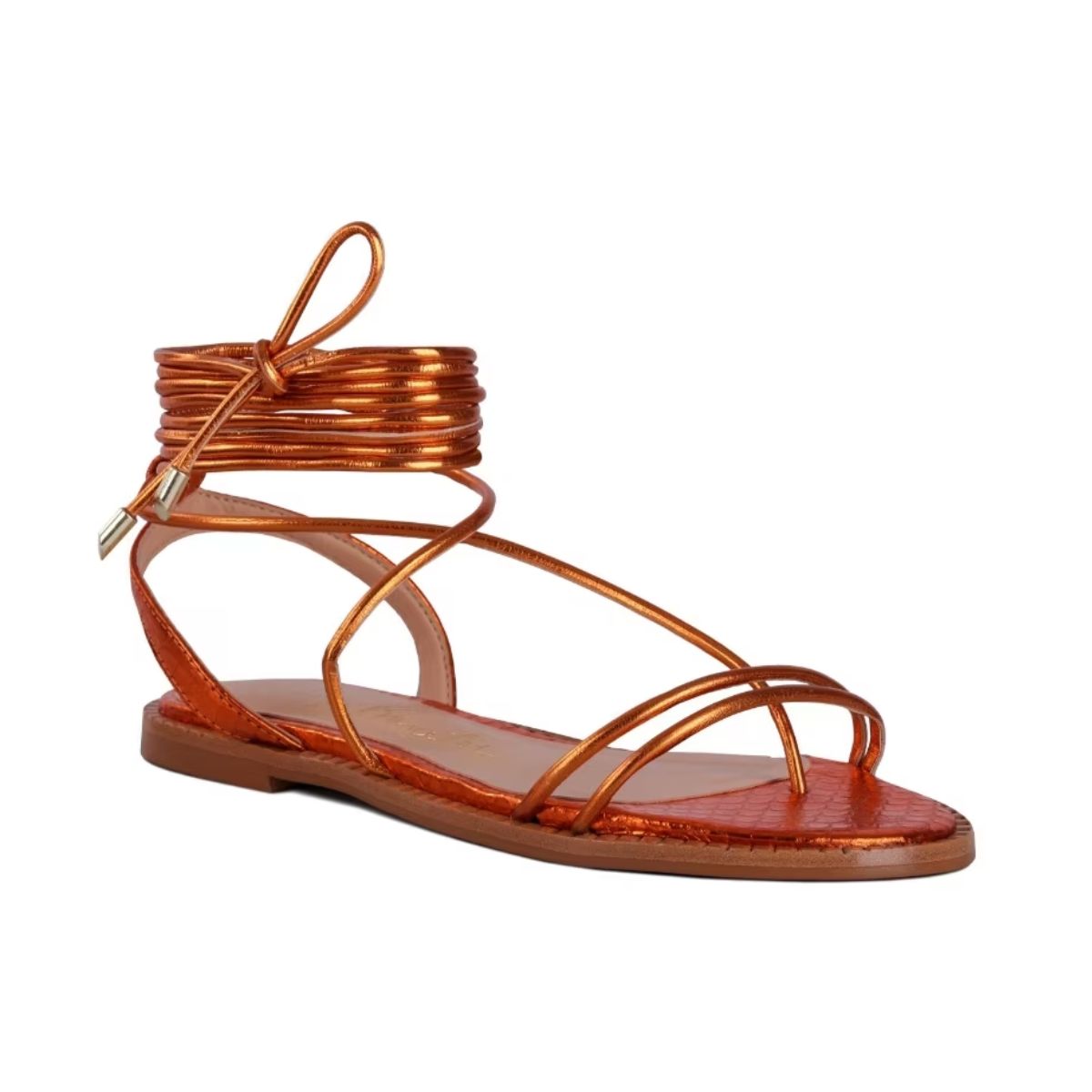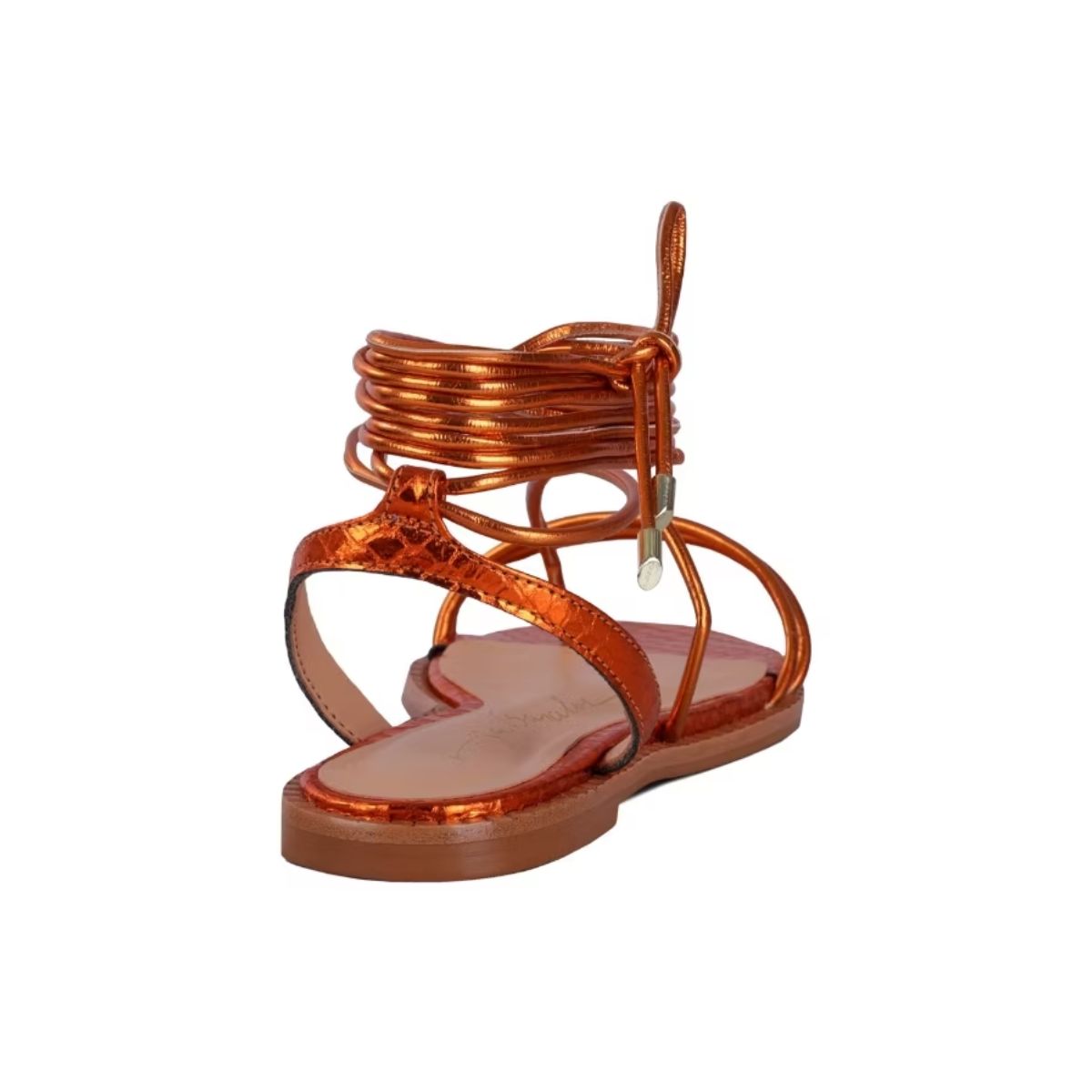 A elegância reside na delicadeza! Por isso, as tiras extremamente finas desta sandália gladiadora convidam à versatilidade das amarrações. O modelo é confeccionado em material tecnológico, na bela tonalidade laranja aperol. Suas amarrações são ultrafinas e longas, o bico é arredondado com uma borda saliente e apresenta ponteiras metálicas.