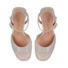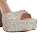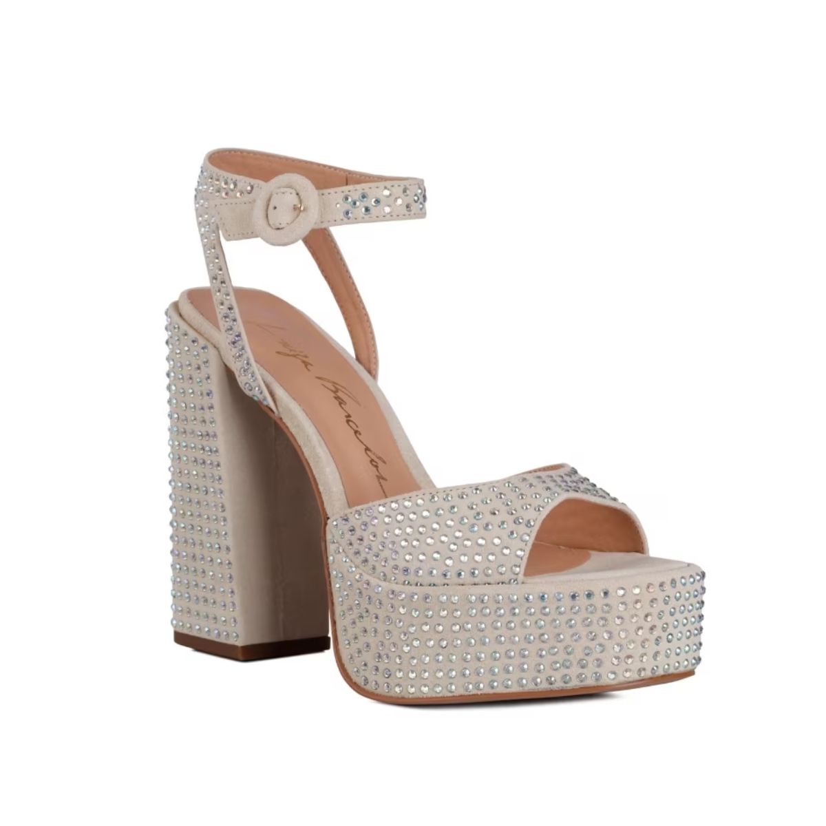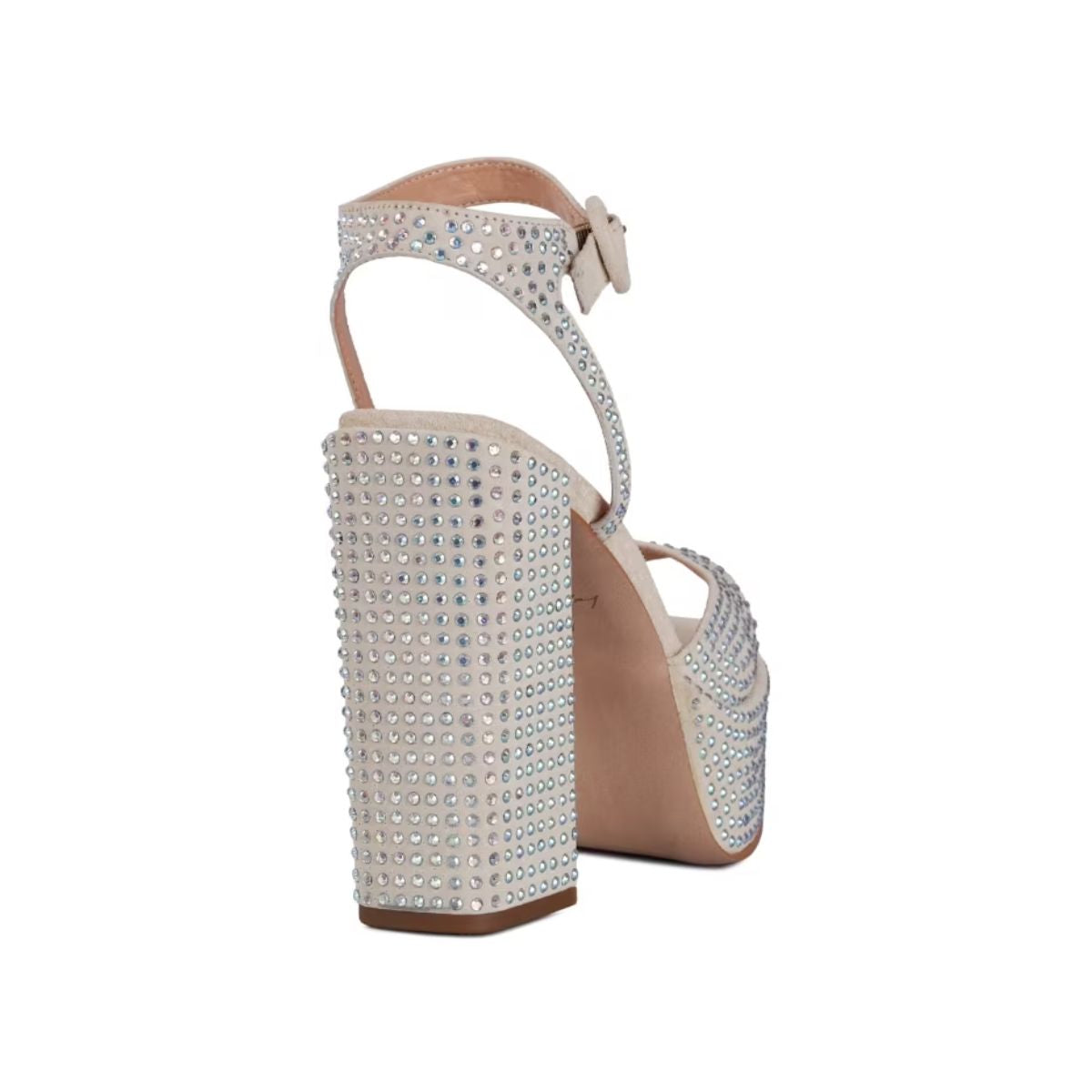 Tendência irresistível, as plataformas voltam com uma reinterpretação ultra moderna. Para tirá-las do imaginário únicamente das festas, uma nova arquitetura foi pensada para imprimir um ar super cool. Os cristais por toda a parte dão o toque final à pegada maxi do modelo. O modelo é produzido em camurça no tom off white com cobertura de cristais no mesmo tom, bico redondo, meia-pata, salto alto bloco e fechamento por fivela de ajuste no tornozelo.