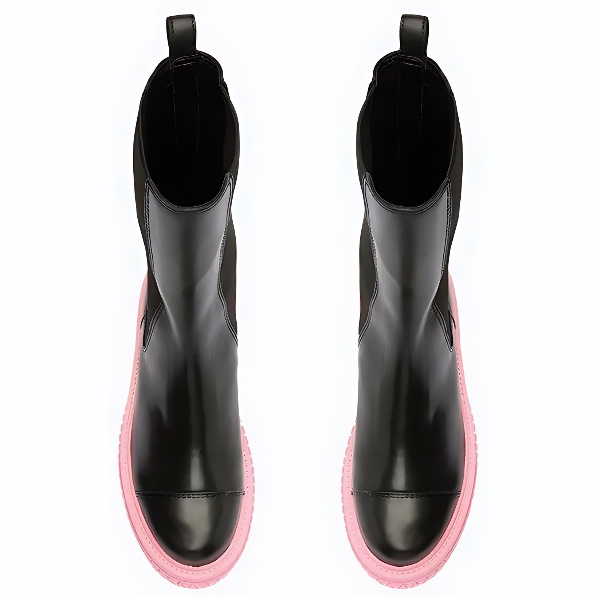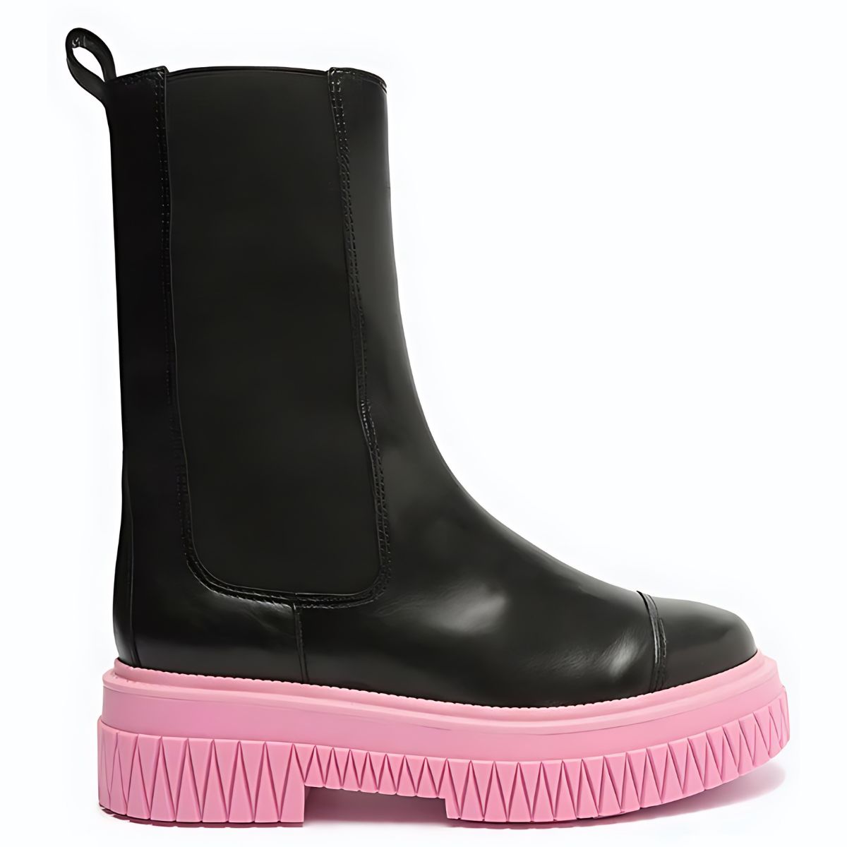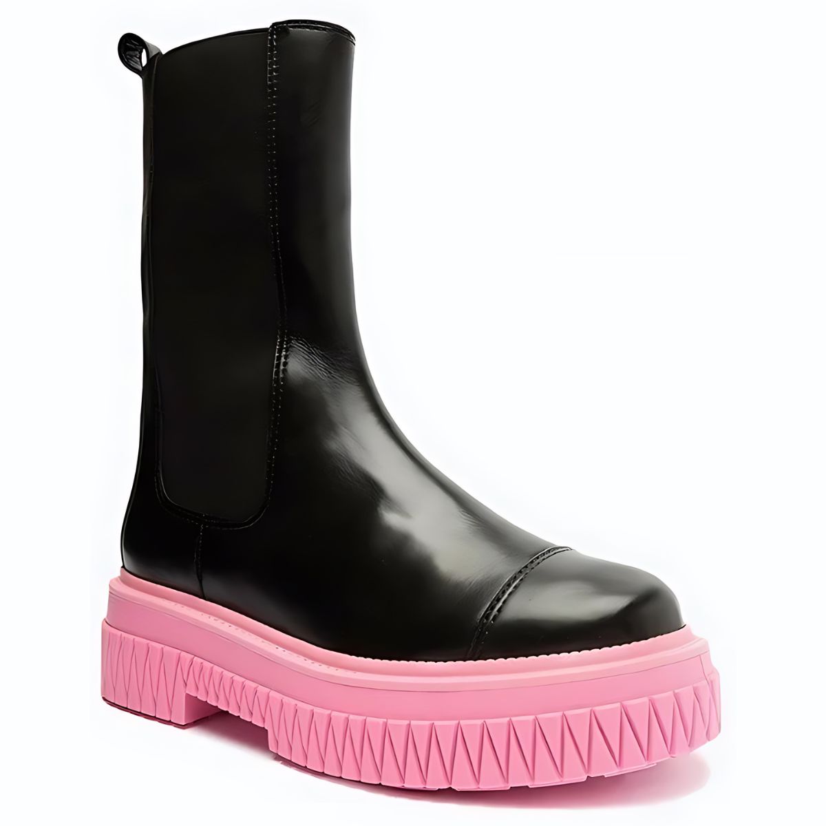 Com um solado rosa cheio de atitude, essa bota de cano médio ganha um contraste incrível com o couro preto e o shape robusto e tratorado. Suas linhas que remetem ao triângulo dão um toque extra de estilo, enquanto o elástico reforça sua praticidade. Impactante e fashion!