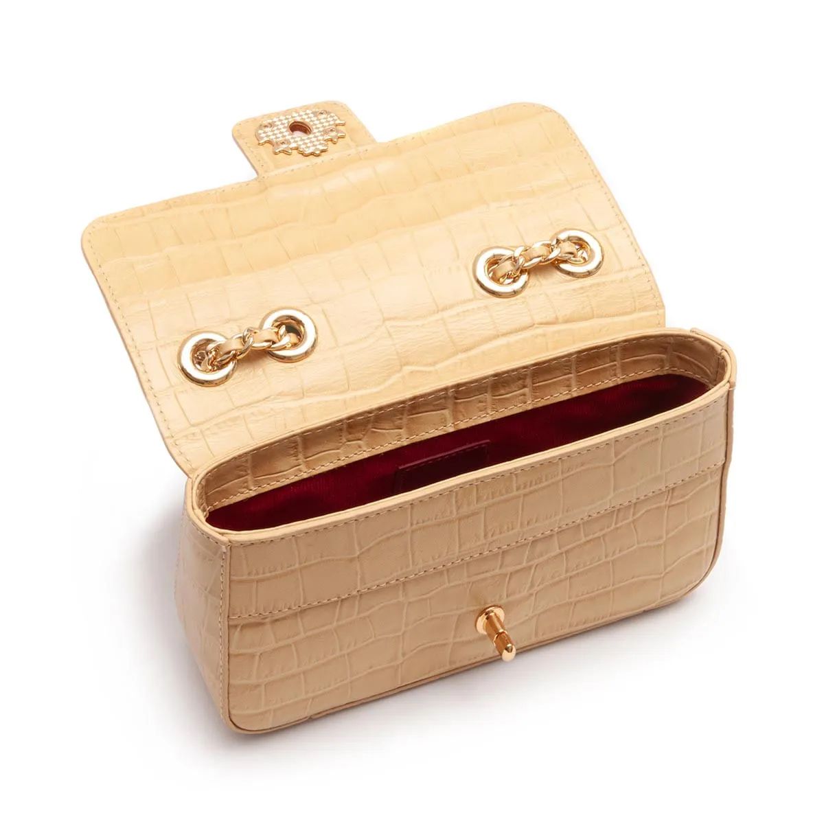Sua linda corrente em elos de metal pode ser removida e usada como um poderoso acessório à parte, ou pode ter sua base unida na estrutura da bolsa, criando um novo shape triangular super cool e charmoso.