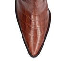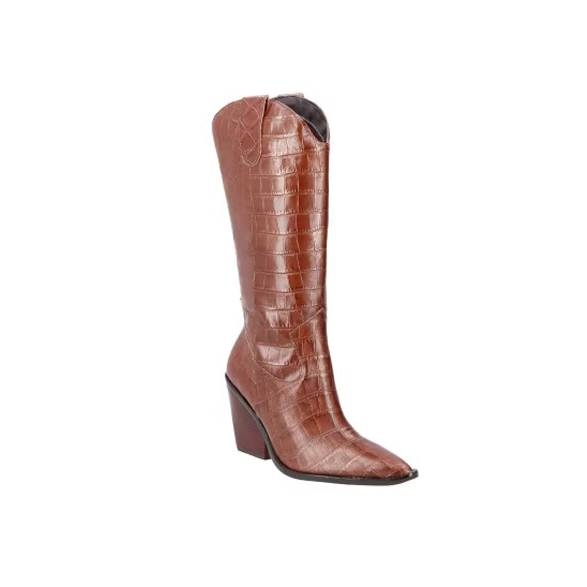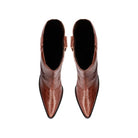 O modelo é produzido em couro com textura croco no tom marrom, possui detalhe de recorte frontal, cano alto com shape western, salto médio geométrico com formato exclusivo, puxador lateral e fechamento por zíper na lateral interna